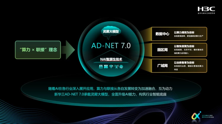 为满足广泛出现的智能化需求,新华三用新技术、新产品、新思路建立起了一套以网强算、以算提智、以智增效的“网、算、智”正循环。AD-NET 7.0通过内置灵犀大模型已全面具备AI能力,结合新华三网络设备内嵌的NAI智原生技术,帮助用户提前享受到AI技术所带来的多重便利。由此,Application Driven和AI Driven的双A驱动也能在用户的业务场景中互为动力,为用户带来更长期、更强劲的价值收益。