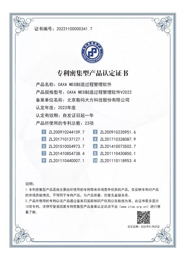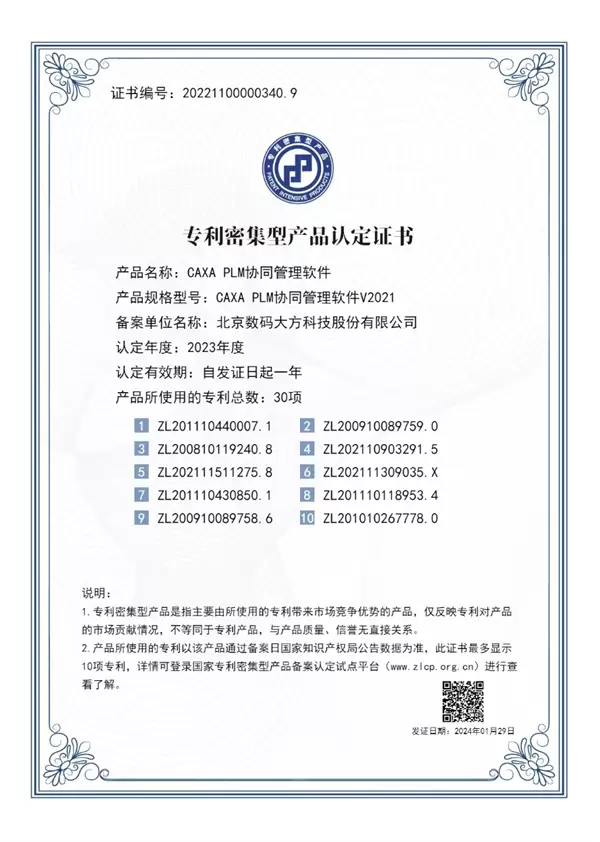 日前,国家知识产权局还公布了《2023年度专利密集型产品名单》,数码大方的三款核心产品——CAXA CAD电子图板、CAXA PLM协同管理、CAXA MES制造过程管理均被认定为国家专利密集型产品,这也是国家知识产权局首批认定的专利密集型产品。此次数码大方获得国家专利密集型产品殊荣,是对公司产品的技术先进性及市场竞争力最权威的肯定和认可。