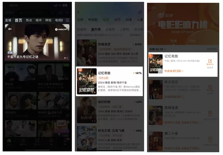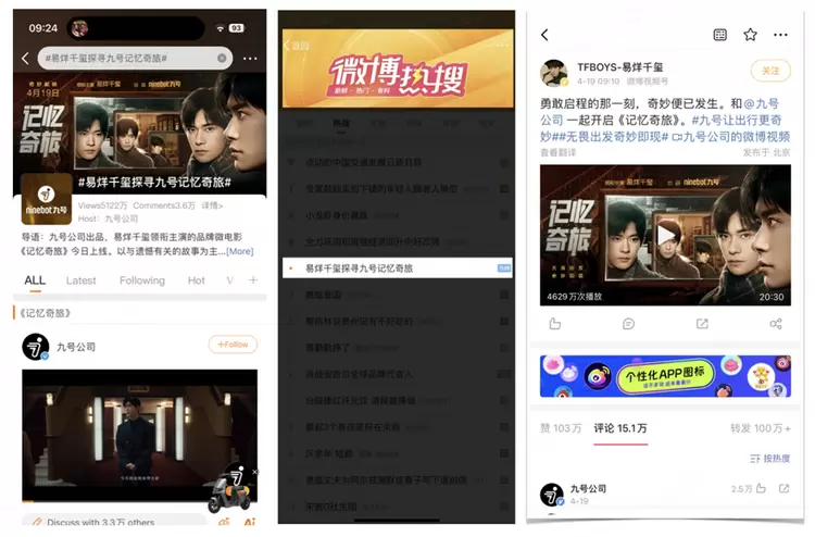 从数据角度来看,九号公司与易烊千玺携手推出的《记忆奇旅》微电影的表现无疑是令人瞩目的。根据统计,上线仅三天,全网累计播放量即超过1.4亿次,总曝光量超过24亿次,互动量达到1500万+,微博电影影响力榜上热映时位居第一,微博话题总阅读量达14亿,热搜话题多达12个。而在爱奇艺平台,该微电影的评分更是高达9.5分,成为爱奇艺历史上首部登上飙升榜的品牌微电影,这无疑是让九号公司和易烊千玺一同火了一把。