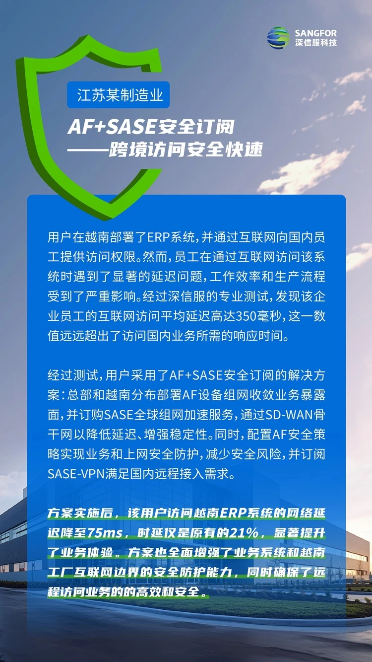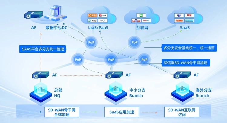 ●优化组网访问体验,可订阅组网加速、跨境业务及海外SaaS加速等多样化需求。在AF+SASE安全栈的支持下,分支机构的互联网访问无需绕行总部,可就近接入安全PoP节点直接访问,享受专线级访问体验。同时,骨干网的稳定性和可靠性得到了显著提升,网络服务可用率达到99.95%以上,业务访问速度可提升10倍+。