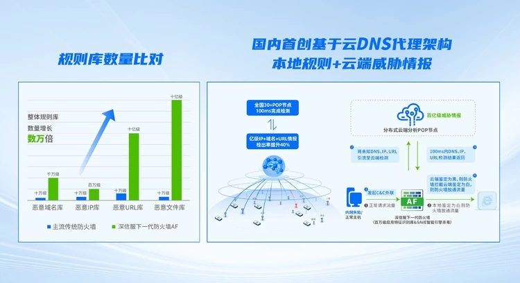 ● 突破传统防火墙本地规则限制,依托深信服30+自建安全PoP节点,实时联动云端百亿级威胁情报,做到恶意IP、URL、DNS,100毫秒内实时拦截,实现已知威胁首包0漏过,网络访问0感知。