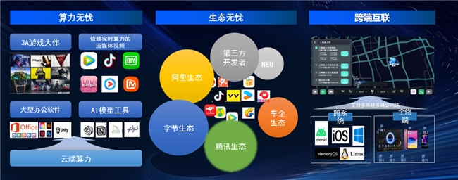东软睿驰云桌面产品作为以云计算和虚拟化为核心技术的智能汽车算力拓展平台,有效突破车端算力瓶颈,为车机系统提供了无限的空间扩展能力,支持跨系统、全终端、全场景的互联互通,实现小算力也可以“踏云”来到数字世界,为用户带来算力无忧、生态无忧、跨端互联的极致体验。