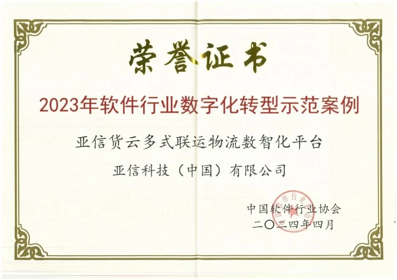 本次大会还面向2023年度技术、业务层面颁发多个奖项,亚信科技旗下亚信货云的“多式联运物流数智化平台”荣获“2023年软件行业数字化转型示范案例”奖。
