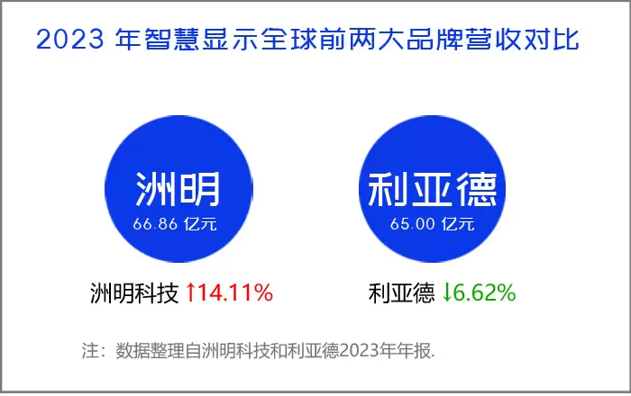 据2023年洲明科技财报显示,其智慧显示板块营收达到66.86亿元。这一营收数据超越了其主要竞争对手利亚德2023年智慧显示业务65.00亿元的营收。作为LED直显领域两家世界性的领头羊,这一数据充分表明,洲明科技在LED智慧显示领域的“世界第一”位置。