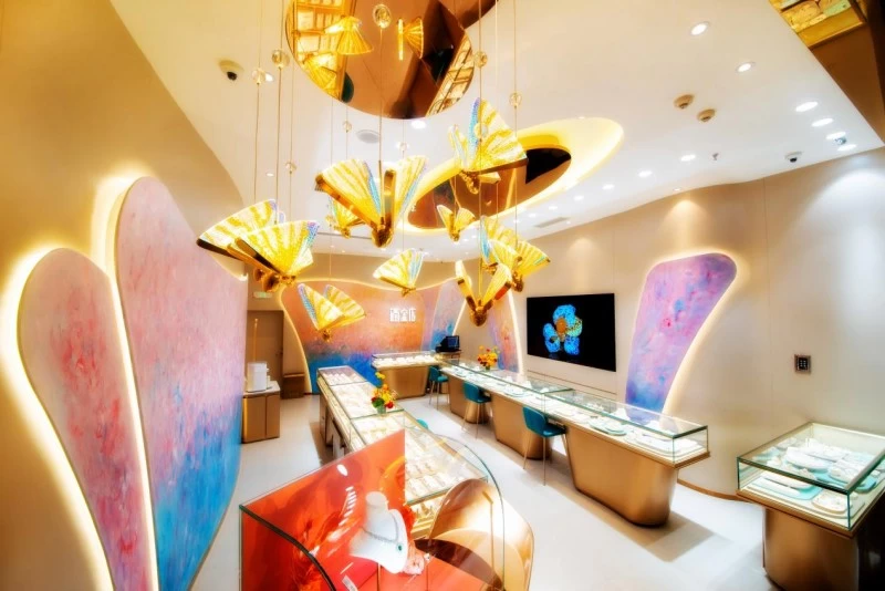以润金店重庆万象城艺术臻品馆为例,我们能够感受润金店珠宝陈列沉浸式体验所带来带来的愉悦感:蝴蝶灵动翩然,马蹄莲悄然盛放,瑰丽旖旎的艺术主题画作也带来了全新的视觉享受,步入其内,仿佛置身于艺术与美的畅想空间。那些陈列在店里的作品像是真正有活力的生命,反复折射万物皆备与人相通的灵光。每道灵光都指向一个通往未来的出口,以先锋之姿,吸引用户踏入另一个令人入迷的万物世间。
