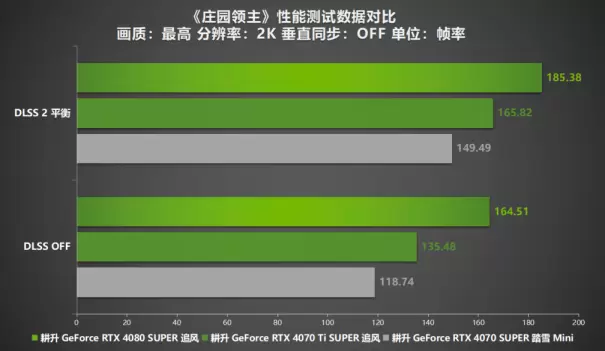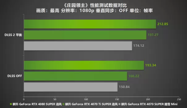 在1080P分辨率下的测试中,《庄园领主》展现出了出色的优化水平。即使不启用DLSS技术,所有测试的三款显卡都能轻松达到平均150帧以上的成绩,确保了游戏体验的极度流畅性。当开启DLSS 2技术的平衡模式时,游戏的帧率更有显著的提高。在DLSS 2技术平衡模式下,耕升 GeForce RTX 4080 SUPER 追风的平均帧数更是飙升到200帧以上,而其他两款显卡的平均帧数也均超过了170帧,较未开DLSS 2时平均提升了114%。这样的性能表现,让玩家在享受精美画面的同时,也能体验到毫无卡顿的流畅游戏体验。