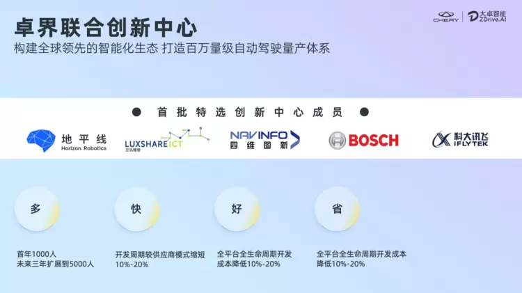发布会上,大卓智能宣布,和博世、地平线、科大讯飞、立讯精密、四维图新,成立“卓界联合创新中心”。这是继年初“大卓智能生态创新联盟”成立后,大卓智能锚定全面产业化目标,积极进行生态圈建设的又一关键举措。从自主开发到核心自研、全栈可控,大卓协同核心伙伴,打造从产品到技术开发,到量产交付再到数据运营的全价值链条,为奇瑞智能化的新征程提供强有力的动力支撑。