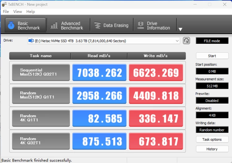 TxBENCH测试,NV7000-t 4TB的写入速度比CDM更快些,达到6623MB/s。4K读取速度为82 MB/s,写入速度为336 MB/s。