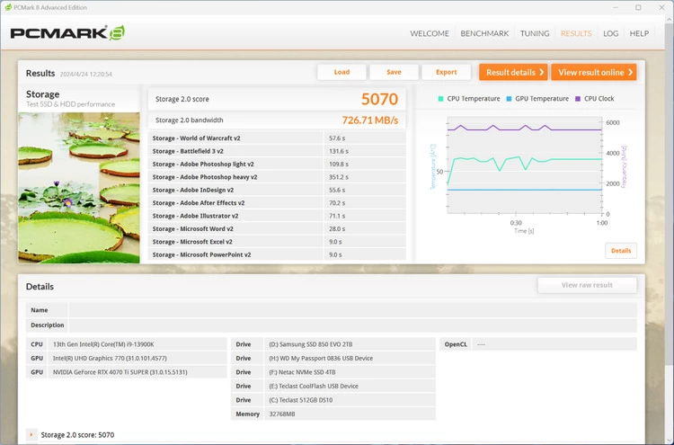 PCMak 8测试中,NV7000-t 4TB存储项得分5070分,带宽速度达到726MB/s。
