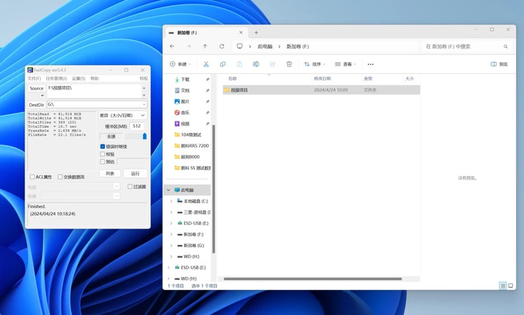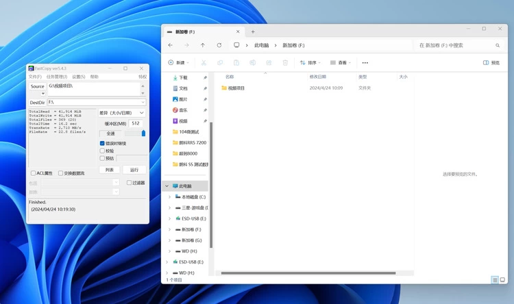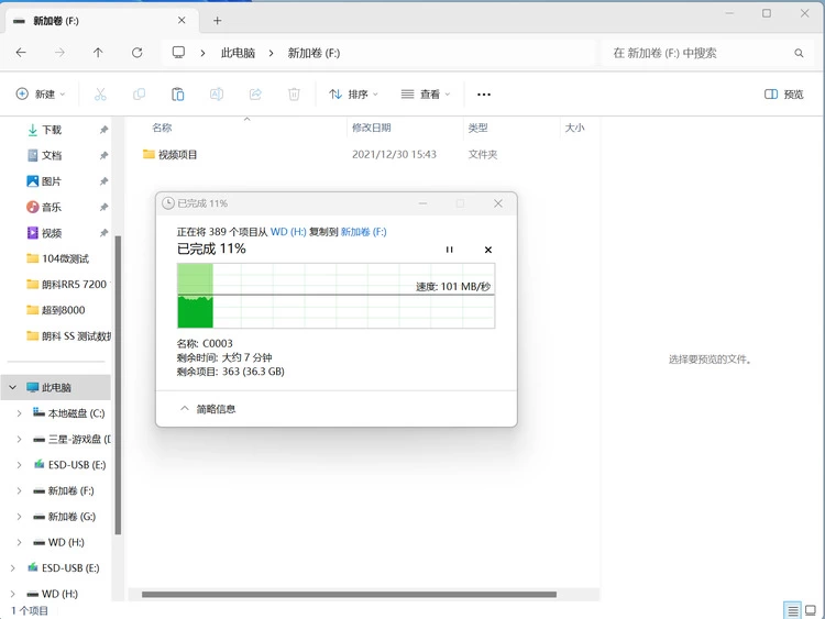 我们使用机械硬盘来传输这个36.3G大文件,传输速度大约只有100MB/s,需要耗时7分钟。对比16秒,由此可见,NV7000-t 4TB无与伦比的速度优势。
