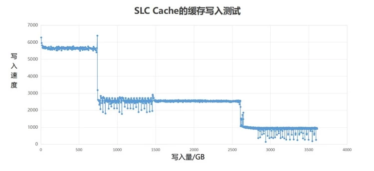 可以看到,刚开始时,写入速度在高位,平均在5800MB/s左右,这就是SLC Cache容量内的写入速度,其SLC Cache容量大约在740GB左右;中间那段是TLC的原始写入速度,平均速度为2500MB/s左右;最后则是空白闪存用光,在一边擦除一边写入,平均写入速度仍旧在1000MB/s左右。就这个表现来说,很多同价位的PCIe4.0 SSD都达不到这个水平。