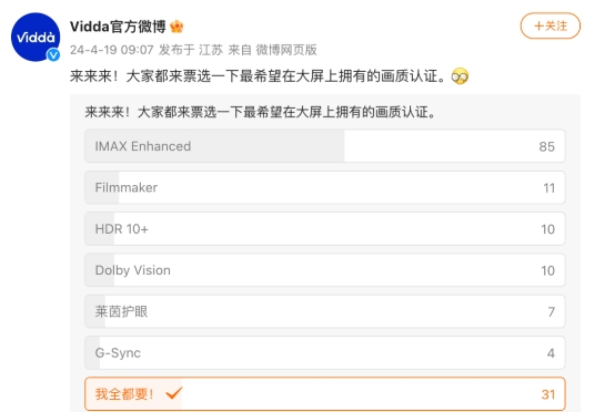 喜欢看电影的小伙伴都知道,在电影院里观影效果最佳的莫过于IMAX厅,其超大的屏幕、清晰的画面、立体音效,带给人无与伦比的观影效果。那么,有没有不出门就可以享受到和IMAX同款投影观影效果投影仪呢?Vidda或将给你答案!目前Vidda在官方微博发起“最希望在大屏上拥有的画质技术认证”投票,投票选项中的IMAX Enhanced以高票数位居第一。要知道,去年Vidda电视就已经获得IMAX Enhanced认证。所以有网友大胆猜测,Vidda投影新品或将搭载IMAX同款画质技术。如此一来,想必Vidda新品将成为投影市场顶级画质的新代表了。