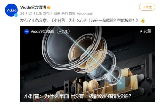 目前各大电商网站销售的冰箱、空调、彩电,一级能效的产品众多,但智能投影基本找不到一级能效的机型。这一局面可能很快会被Vidda打破。Vidda官方微博发布的小科普文章“为什么市面上没有一级能效的智能投影?”,有网友猜测Vidda投影新品可能会做到一级能效,如果属实,这将是投影行业首台一级能效产品。