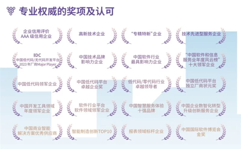 葡萄城作为专业的软件开发技术和低代码平台提供商,以“赋能开发者”为使命。目前,葡萄城的产品广泛应用于信息和软件服务、制造、交通运输、建筑、金融、能源、教育、公共管理等支柱产业,在行业内备受认可,荣获多项荣誉称号。