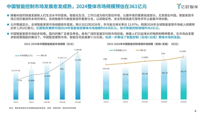 报告显示, 2024年—2026年,中国智能家居整体市场规模将保持14%的复合增长率稳步增长,并带动有线智能控制行业的快速发展。