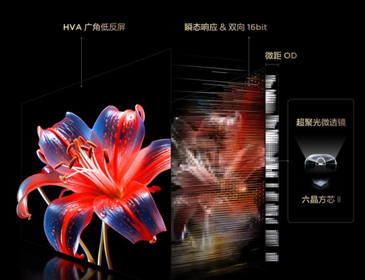 为了解决光晕对画面和观感的影响,TCL Q10K Pro搭载了行业最全面的光晕控制方案——TCL全域光晕控制技术,通过六晶方芯II、超聚光微透镜、瞬态响应和双向16bit、微距OD以及HVA广角低反屏这五大先进技术的集成,全链路抑制光晕产生,让画面变得更通透。