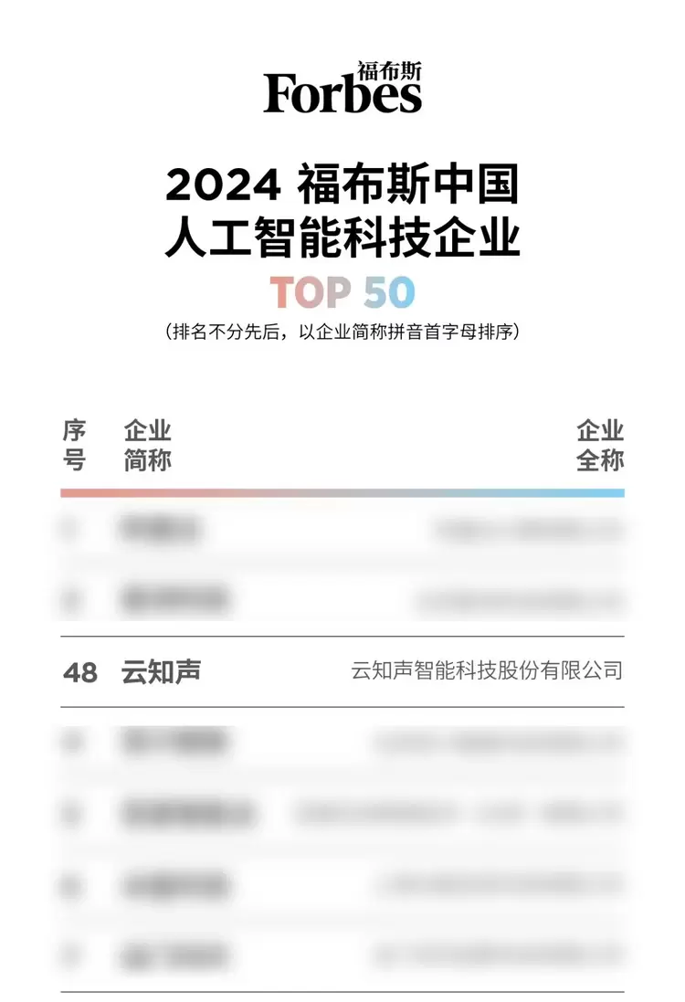 近日,福布斯中国公布“2024福布斯中国人工智能科技企业TOP 50”评选结果。云知声凭借在人工智能领域的卓越表现,成功跻身TOP 50榜单,再获行业权威认可。
