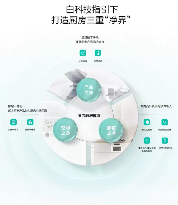 2023年,华帝首次提出“净洁厨房”体系,主张从产品、空间、感官三个维度打造厨房的新“净”界,再次开创行业先河。