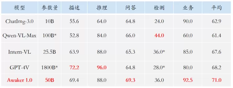 我们发现,Awaker 1.0的基座模型在视觉问答和业务应用任务上超过了GPT-4V、Qwen-VL-Max和Intern-VL,同时它在描述、推理和检测任务上也达到了次好的效果。总体而言,Awaker 1.0的平均得分超过国内外最先进的三个模型,验证了多任务MOE架构的有效性。下面是几个具体的对比分析例子。