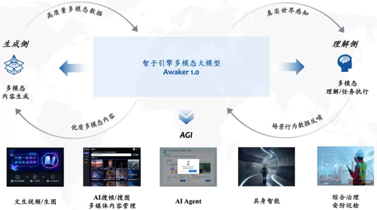 Awaker 1.0是一个将视觉理解与视觉生成进行超级融合的多模态大模型。在理解侧,Awaker 1.0与数字世界和现实世界进行交互,在执行任务的过程中将场景行为数据反哺给模型,以实现持续更新与训练;在生成侧,Awaker 1.0可以生成高质量的多模态内容,对现实世界进行模拟,为理解侧模型提供更多的训练数据。尤其重要的是,因为具备“真正”的自主更新能力,Awaker 1.0适用于更广泛的行业场景,能够解决更复杂的实际任务,比如AI Agent、具身智能、综合治理、安防巡检等。