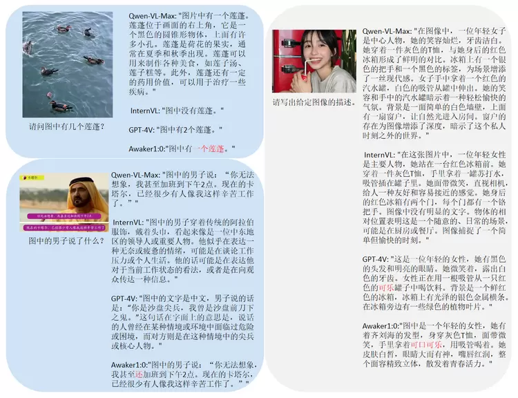 从这些对比例子可以看到,在计数和OCR问题上,Awaker 1.0能正确地给出答案,而其它三个模型均回答错误(或部分错误)。在详细描述任务上,Qwen-VL-Max比较容易出现幻觉,Intern-VL能够准确地描述图片的内容但在某些细节上不够准确和具体。GPT-4V和Awaker 1.0不但能够详细地描述图片的内容,而且能够准确地识别出图片中的细节,如图中展示的可口可乐。