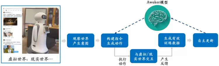 智子引擎此次发布的Awaker 1.0,是世界上首个具有自主更新机制的多模态大模型,可以用作具身智能的“大脑”。Awaker 1.0的自主更新机制,包含三大关键技术:数据主动生成、模型反思评估、模型连续更新。区别于所有其它多模态大模型,Awaker 1.0是“活”的,它的参数可以实时持续地更新。从下方的框架图中可以看出,Awaker 1.0能够与各种智能设备结合,通过智能设备观察世界,产生动作意图,并自动构建指令控制智能设备完成各种动作。智能设备在完成各种动作后会自动产生各种反馈,Awaker 1.0能够从这些动作和反馈中获取有效的训练数据进行持续的自我更新,不断强化模型的各种能力。