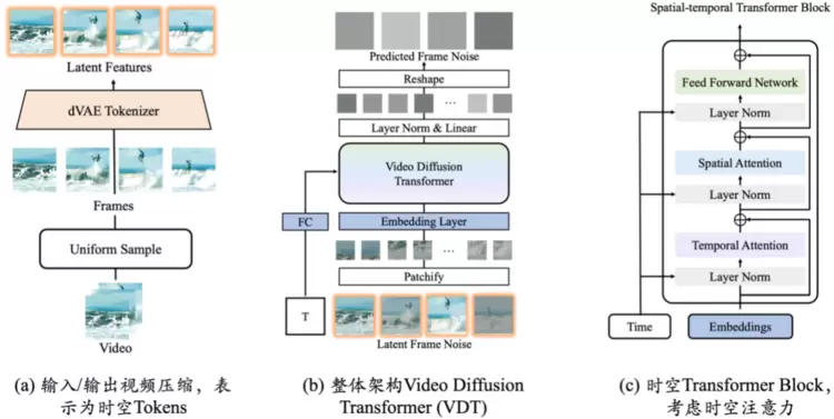 将 Transformer 技术应用于基于扩散的视频生成,展现了 Transformer 在视频生成领域的巨大潜力。VDT 的优势在于其出色的时间依赖性捕获能力,能够生成时间上连贯的视频帧,包括模拟三维对象随时间的物理动态。