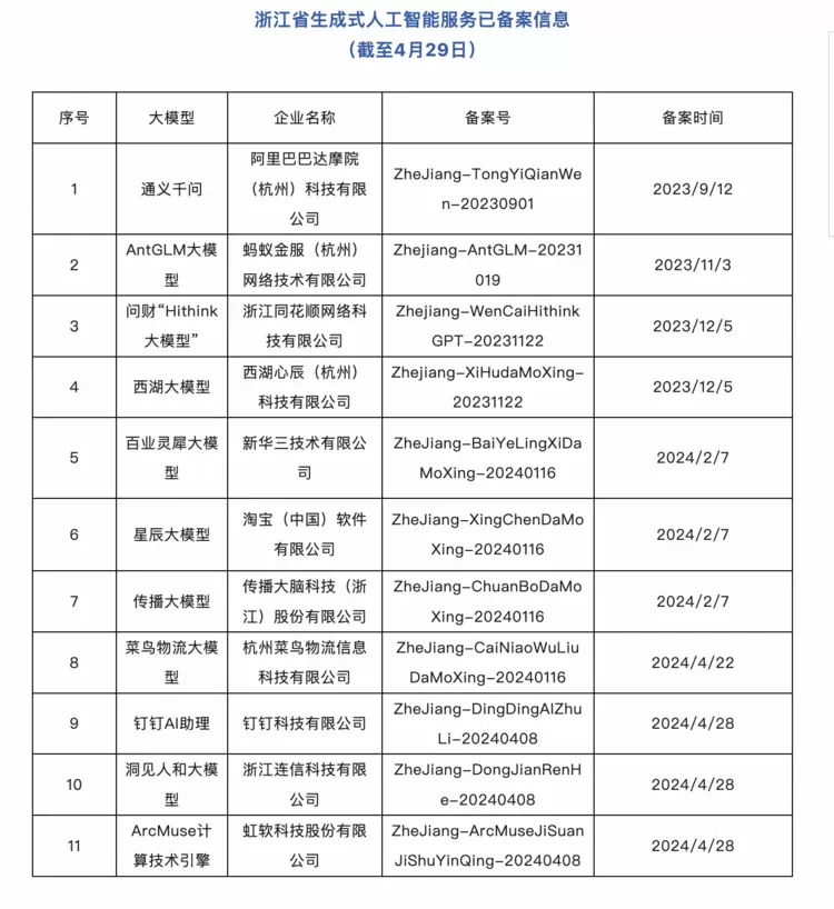 4月29日晚,浙江省网信办发布“生成式人工智能服务已备案信息公告”(以下简称:公告),钉钉AI助理通过国家大模型服务备案。