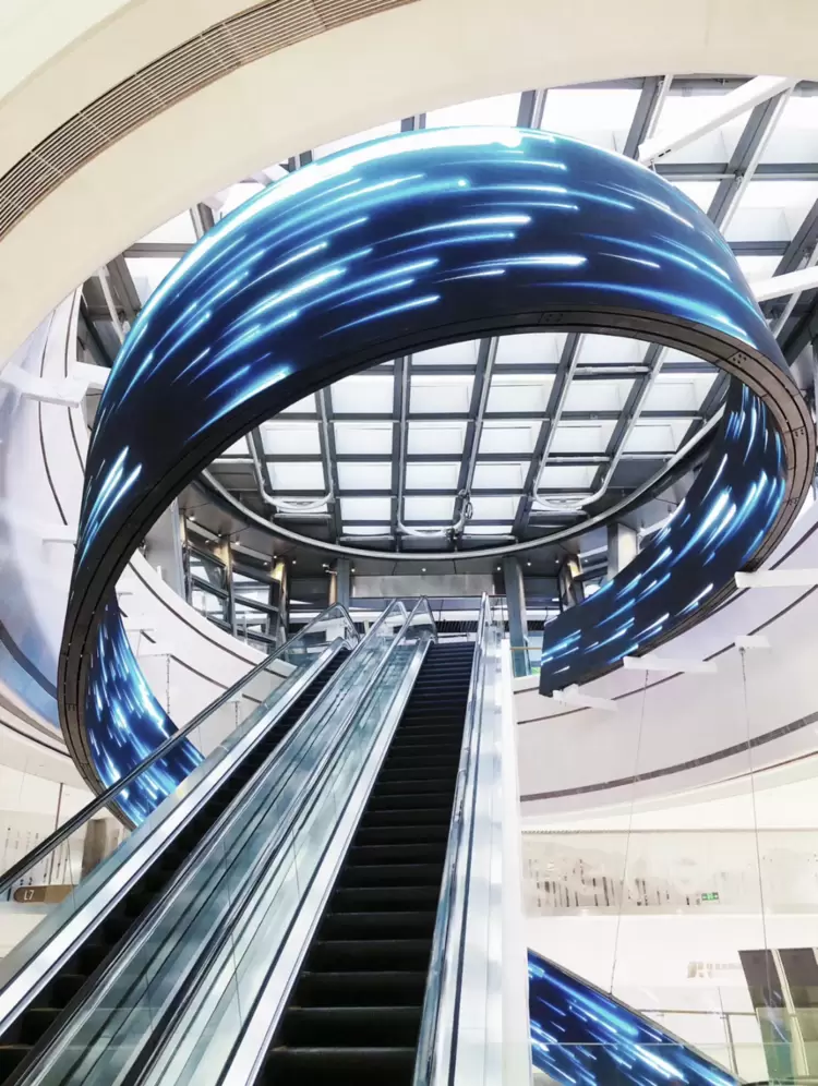 视爵光旭在广州星寰国际中心打造一条创意双面丝带屏在小红书等各大平台爆火,屏体呈螺旋状,环绕四楼到八楼直径达11米的直梯,长度达133.76米,总面积达428.32㎡,一举创出LED显示屏领域的新吉尼斯纪录。