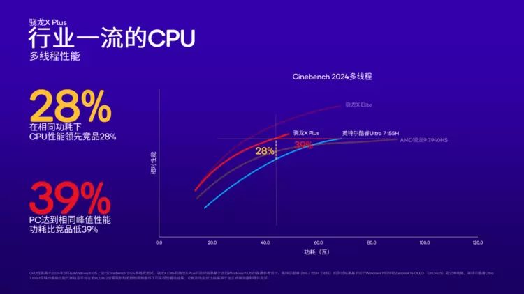 在 Cinebench 2024 多线程测试中,我们也能看到类似的情况。相比英特尔酷睿 Ultra 7 155H,骁龙 X Plus 在相同功耗下的性能领先 28%,相同峰值性能下的功耗低了 39%。