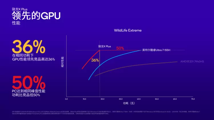 当然不只是 CPU。在 WildLife Extreme 测试中,骁龙 X Plus 在相同功耗下的 GPU 性能,领先英特尔酷睿 Ultra 7 155H 高达 36%,相同峰值性能下的功耗仅为后者的一半。