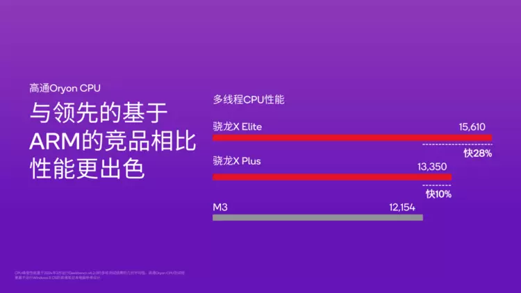 即便按照最新的实测数据,骁龙 X Elite 在 CPU 多线程性能上依然比苹果最新的 M3 快了 28%;对比英特尔最新的酷睿 Ultra 7 155H,同等功耗下,骁龙 X Elite 可以提供超过 50%的性能提升,在同等性能下,则能实现不低于 60%的功耗降低。