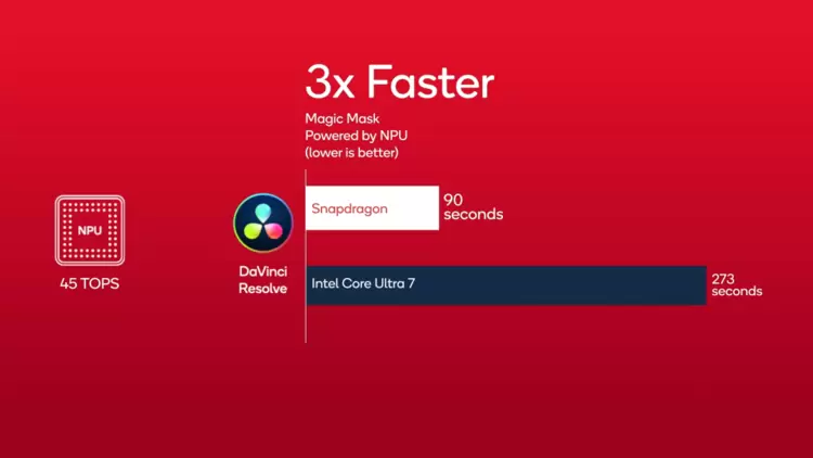 实测显示,包括骁龙 X Plus、骁龙 X Elite 在视频剪辑软件「DaVinci Resolve」中运行「神奇遮罩」功能,要比英特尔酷睿 Ultra 7 还要快上 3 倍,在本地「文生图」中同样也比 x86 竞品快 3 倍。
