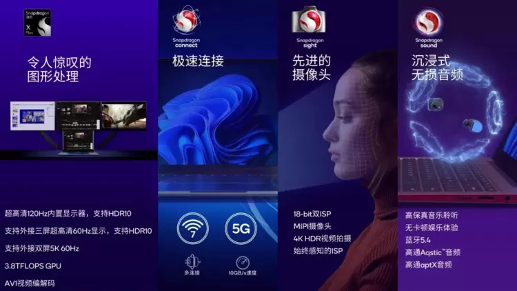 此外在影像和音频方面,骁龙 X Plus 也支持 18-bit 双 ISP 和 MIPI 摄像头,能够提供先进的图像和视频功能,以及领先的 Snapdragon Sound 骁龙畅听技术特性,包括蓝牙 5.4 音频传输等。