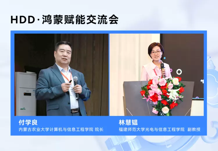 作为高校科技教育实践工作者,内蒙古农业大学计算机与信息工程学院院长付学良,联动内蒙古多所高校,引入HarmonyOS技术课程内容,目前已赋能1000+位高校开发者,为高校HarmonyOS人才培养计划作出积极贡献。付学良院长表示:从1月华为宣布首批200多家应用厂商在加速开发鸿蒙原生应用,到3月底超过4000个应用加入鸿蒙生态,随着越来越多的应用鸿蒙化转型,对鸿蒙相关岗位的需求也将随之增加。高校应坚定抓住鸿蒙生态机遇,发挥自身科研优势快速培养HarmonyOS人才,响应市场对HarmonyOS人才的迫切需求。福建师范大学光电与信息工程学院林慧韫老师和施文灶老师也分享道:福建师范大学光电与信息工程学院在积极探索HarmonyOS课程创新和信创融合,通过专业建设、竞赛赋能、鸿蒙原生应用开发实践等各类形式推动HarmonyOS人才实训体系建立,为鸿蒙生态的持续创新和繁荣发展提供储备充足的“人才粮仓”。