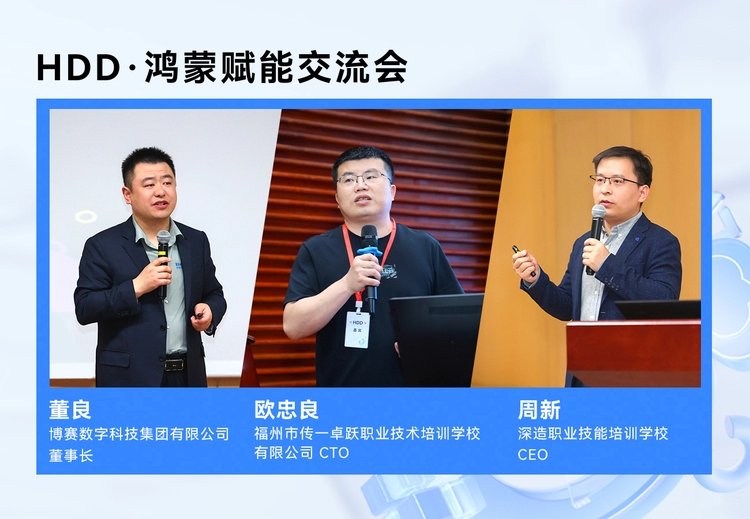 围绕鸿蒙生态大量的用人需求及数字产业生态环境的现况,博赛数字科技集团董事长董良、深造职业技能培训学校CEO兼院长周新、福州市传一卓跃职业技术培训学校有限公司CTO欧忠良分别展示了赋能机构如何产教融合,创建以5个中心、4个围绕、3方合作、2个认证、1套平台等多模式全场景的鸿蒙创新培育体系,助力HarmonyOS人才培养。其中,周新院长向现场开发者分享了深圳针对鸿蒙扶持的政策:HarmonyOS人才培养是整个社会的大势所趋,为打造鸿蒙生态代表之城,深圳已率先出台《深圳市支持开源鸿蒙原生应用发展2024年行动计划》,预计在2024年内实现深圳市鸿蒙原生应用数量占全国总量10%以上,建成2家以上以鸿蒙原生应用软件开发、应用企业为主的专业产业园,深圳市主要垂域实现鸿蒙原生应用全覆盖的繁荣景象,并表示:为完成深圳市鸿蒙生态的目标,我们专门建设了HarmonyOS人才培育基地,截止4月,各类培训已累计近5万人,2024下半年将继续主导以校企合作、企业认证等培育形式,扩大HarmonyOS人才储备池!