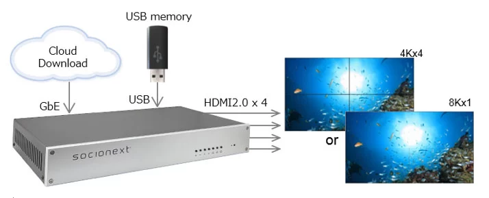 针对以上行业难题,Socionext推出了s8媒体播放器。这款媒体播放器机身尺寸为400×200×50mm,采用外置供电方案,功率只有50W,是目前可用的外观最小巧的8K媒体播放器。s8媒体播放器搭载Socionext独自研发的8K/60p TS流专用HEVC解码器LSI BONNY(SC1400A),并配有2个USB2.0,1个USB3.0和Gb Ether网口输入口,支持本地媒体回放和影像云端实时解码内容的播放,即用户制作或够买的8K内容可以通过平台发送到s8播放器,或直接通过USB本地存储播放,轻松享受8K/60p的超精细影像魅力。