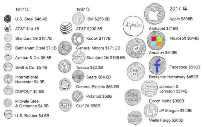 自1917年至2017年,美国最大的几家公司名单的演变。