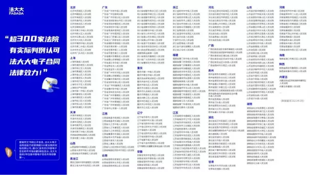 ●法大大电子合同在全国超300家法院的实际判例中被采信,成为业界可查司法判例最多的电子签名服务商。