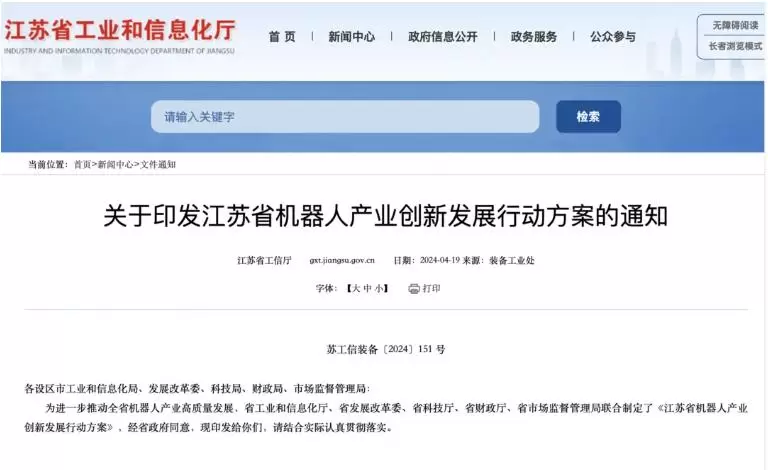 4月23日,江苏省工业和信息化厅、省发展改革委、省科技厅、省财政厅、省市场监督管理局联合制定了《江苏省机器人产业创新发展行动方案》,于近日印发。