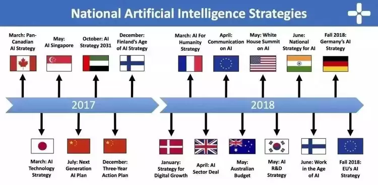 加拿大的《泛加拿大人工智能战略》(Pan-Canadian Artificial Intelligence Strategy)、丹麦于 2018 年 1 月发布的《丹麦数字技术增长战略》、欧盟委员会于2018 年 4 月通过了《人工智能通讯》、芬兰的《芬兰的 AI 时代》与《AI 时代的工作》、法国的“十五亿欧元计划”、印度的《国家人工智能战略》(National Strategy for Artificial Intelligence)等等成为发展AI的重要战略举措。