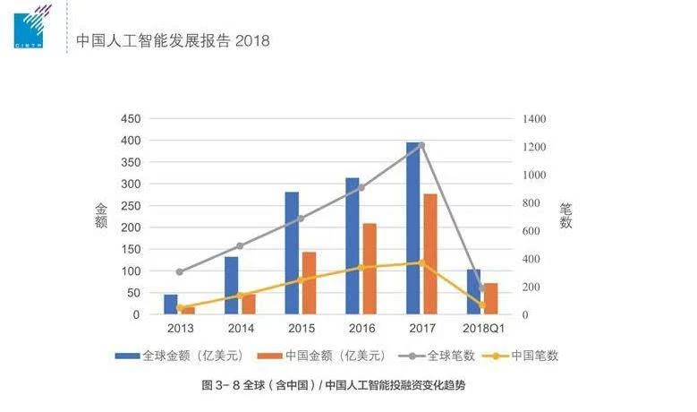 据了解,2017全年,大陆AI企业的融资总额已占到全球的7成。根据北京清华大学发布的《中国人工智能发展报告2018》显示,2017年年全球人工智能投融资总规模达395亿美元,融资事件1208笔,其中中国的投融资总额达到277.1亿美元,融资事件369笔,分别占全球的70%和31%。