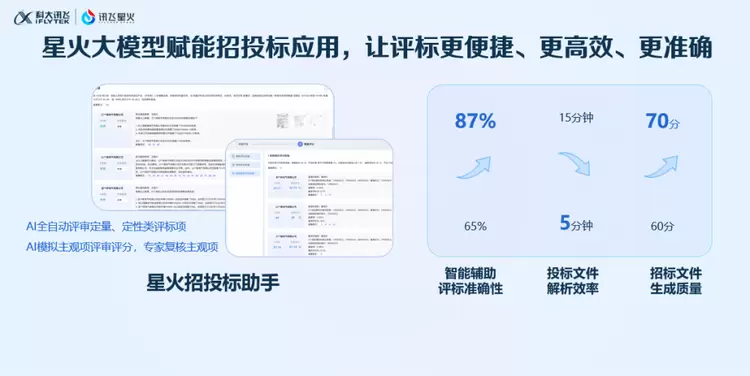 据介绍,升级后的星火招投标助手的智能辅助评标准确性达到87%、投标文件解析效率从15分钟缩减到5分钟、招标文件生成质量达到70分,帮助行业释放新质生产力。