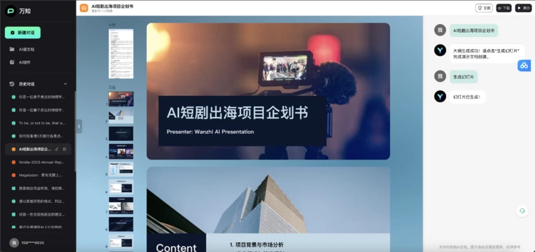 曾几何时,Boss 一阵夺命连环call,打工人就要立马交付各种PPT。现在,仅靠万知微信小程序就能帮你做得有模有样:用户只需要在手机页面输入相关PPT主题,万知就能生成文字大纲,经用户确认后万知还支持一键生成PPT。得益于RAG实时检索,万知AI能够基于“大脑知识+新鲜实事”生成PPT大纲,辅之以多种版式和AI配图,一份精美的PPT两分钟就能出炉。