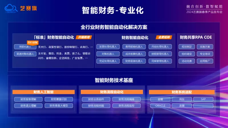 艺赛旗联合创始人、联席CTO吴鑫表示,当前财务正在从“老三化”走向“新三化”,即从专业化、标准化、流程化转向自动化、智能化和数字化,艺赛旗超自动化矩阵作为财务领域的创新技术,能够助力这一转变。