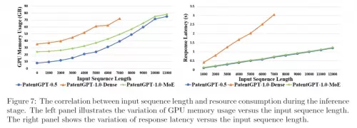 下图展示了输入序列长度与推理阶段资源消耗之间的关系。结果表明,所有模型的GPU内存使用量与它们的参数数量和输入序列长度都呈正相关。其中,“智慧芽专利大模型-1.0-MoE”在输入序列长度增加时GPU内存使用量的增加最小,表明其在涉及长上下文场景的应用中更具资源效率。
