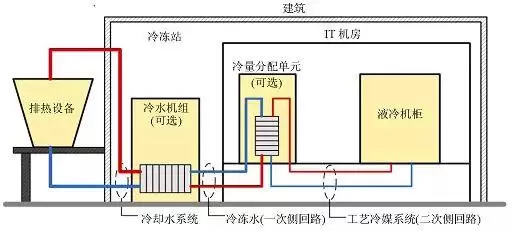 将发热元件如CPU和GPU,放置于液体流经的冷板上,有效率地导热。系统从室内的热交换器将热量转移到室外的冷却塔,完成循环。