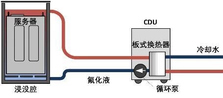 通过直接将发热器件浸入不导电的冷却液中实现高效散热。室内侧,单相系统中元件直接浸于冷却液中,而在两相系统中,发热器件被浸入低沸点液体中,液体吸热沸腾并在冷凝器中变回液态,持续循环散热。室外侧相似于冷板式系统,热液在室外冷却塔释放热量后低温回环,进行循环散热。