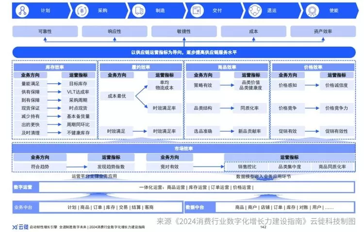 供应链全场景数字化运营是供应链全链条数字化运营迭代,以供应链各个节点的运营指标为导向,形成一体化数据运营机制,逐步提高供应链服务水平,实现单环节资源效率最优化,同时不断沉淀数字资产。