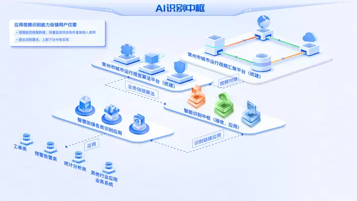 今年以来,AI识别中枢在作为常州市城市运行管理服务平台底座能力之一以外,深度融入“运管服”智慧街镇一体化平台建设模式中,真正解决街镇用户在视频AI识别应用上动辄上百万软硬件投入,大多却只能停留在“看”的现实痛点,以“软件系统不用建、算法模型直接用、街镇只需投硬件、数据应用全联动”的形式使视频AI识别应用真正落地,助力街镇各项治理工作智慧化能力得到质的提升。